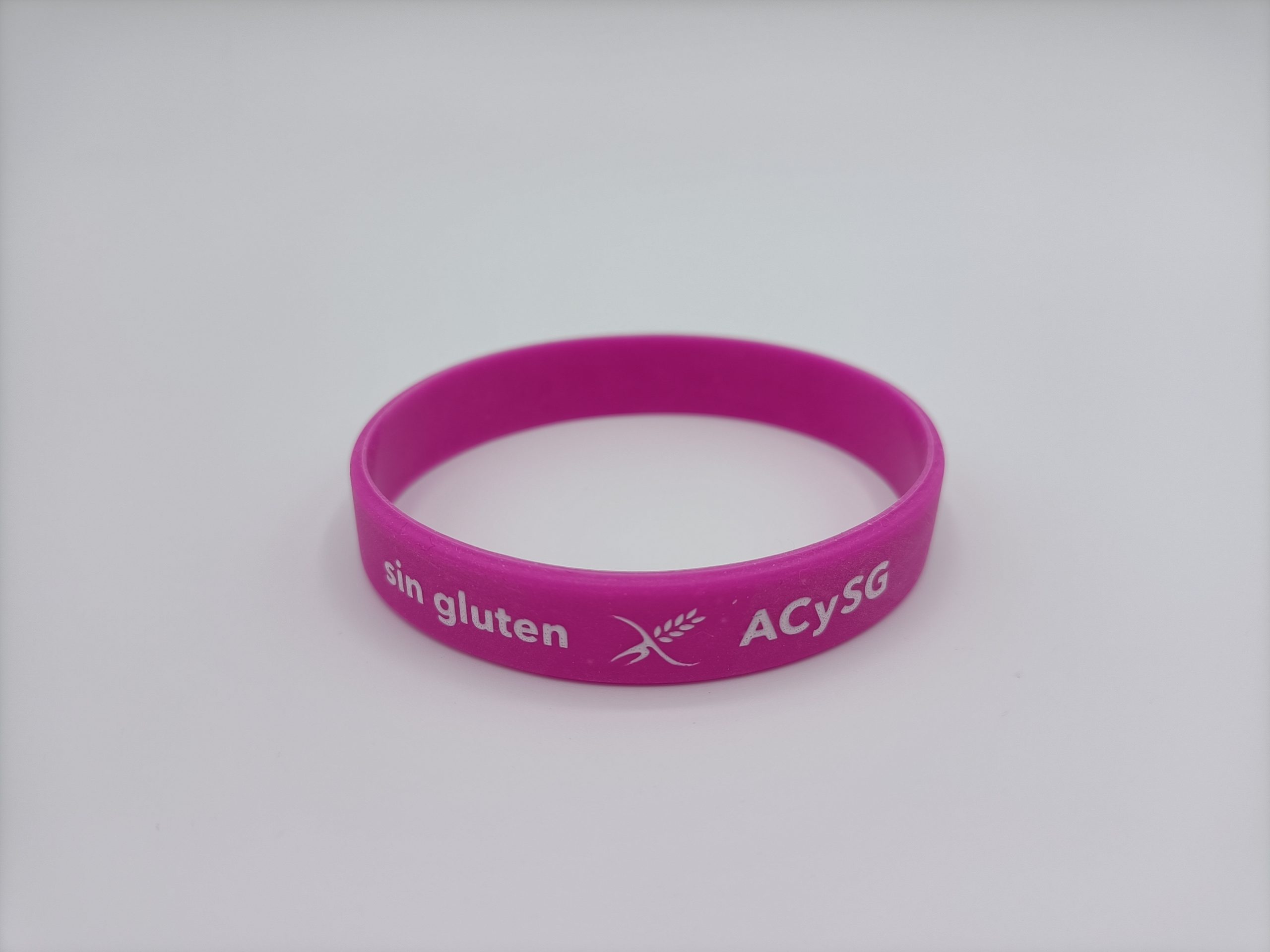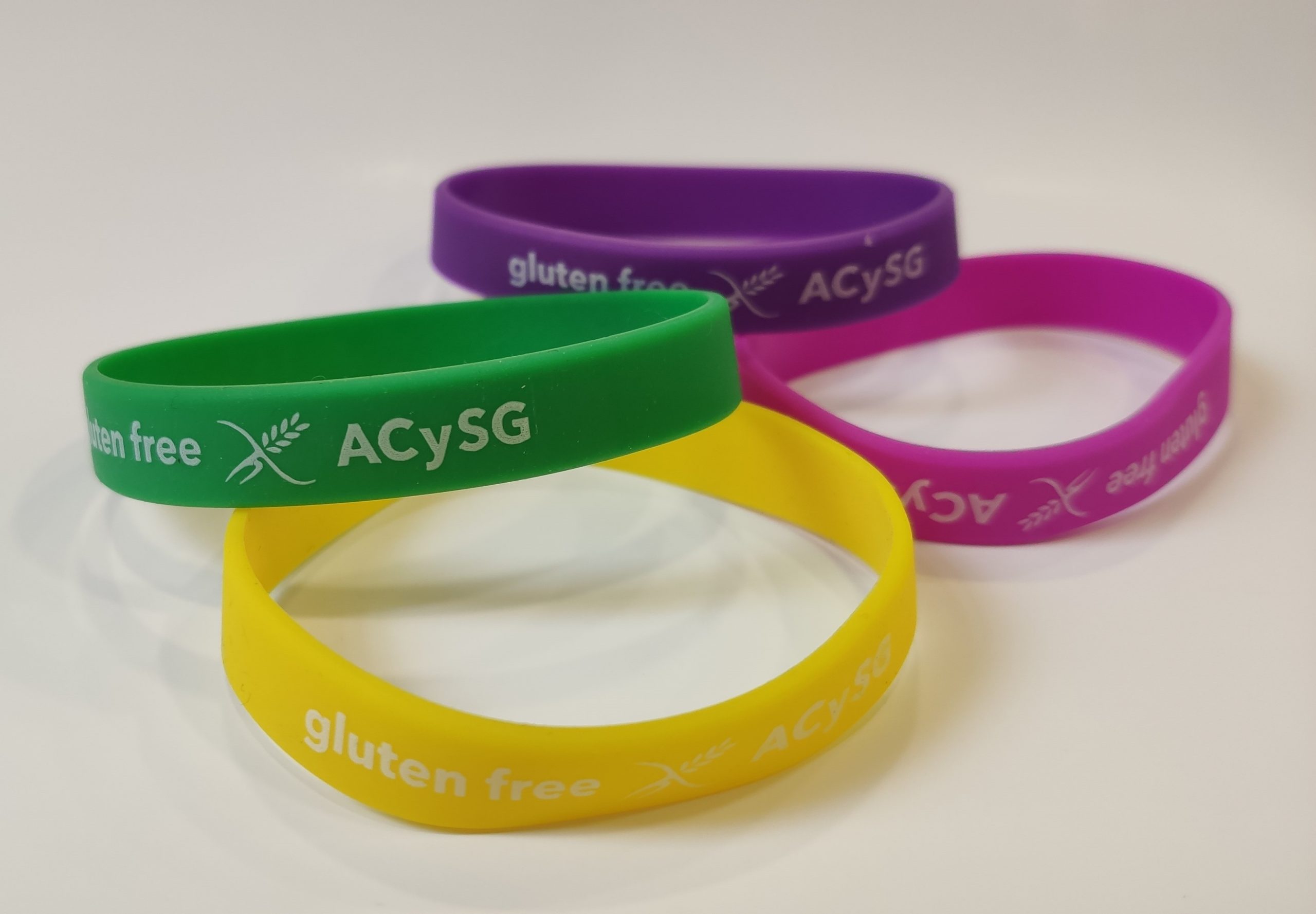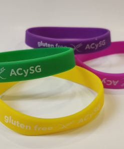 Lote de 4 pulseras de silicona en cuatro colores, amarillo, fucsia, azul y verde; con nuestro logo y ACySG y también nuestra leyenda «sin gluten» «gluten free»