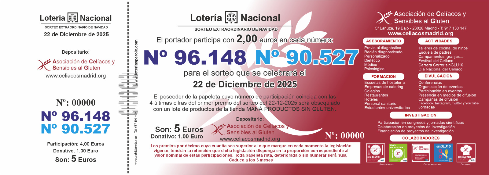 Compra tu participación de Navidad, juegas dos euros a cada número. El euro restante estará destinado a investigación y además entras en la rifa de un lote de productos cortesía de la tienda MANÁ.