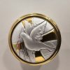 +34670387514Caja de metal dorado o «viatico» en forma redonda que se utiliza para llevar formas sin gluten para tomar la sagrada comunión.
