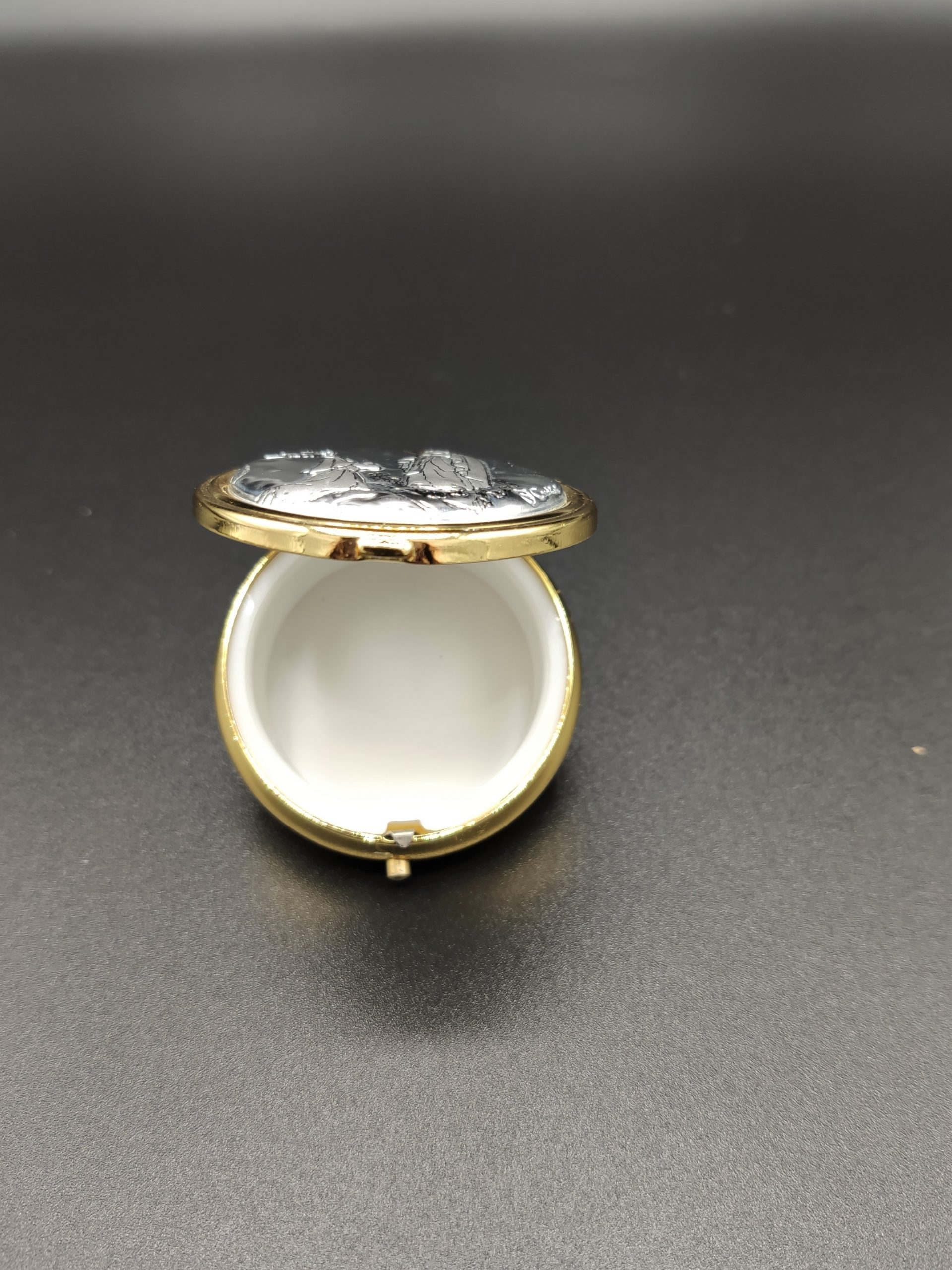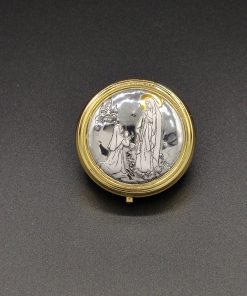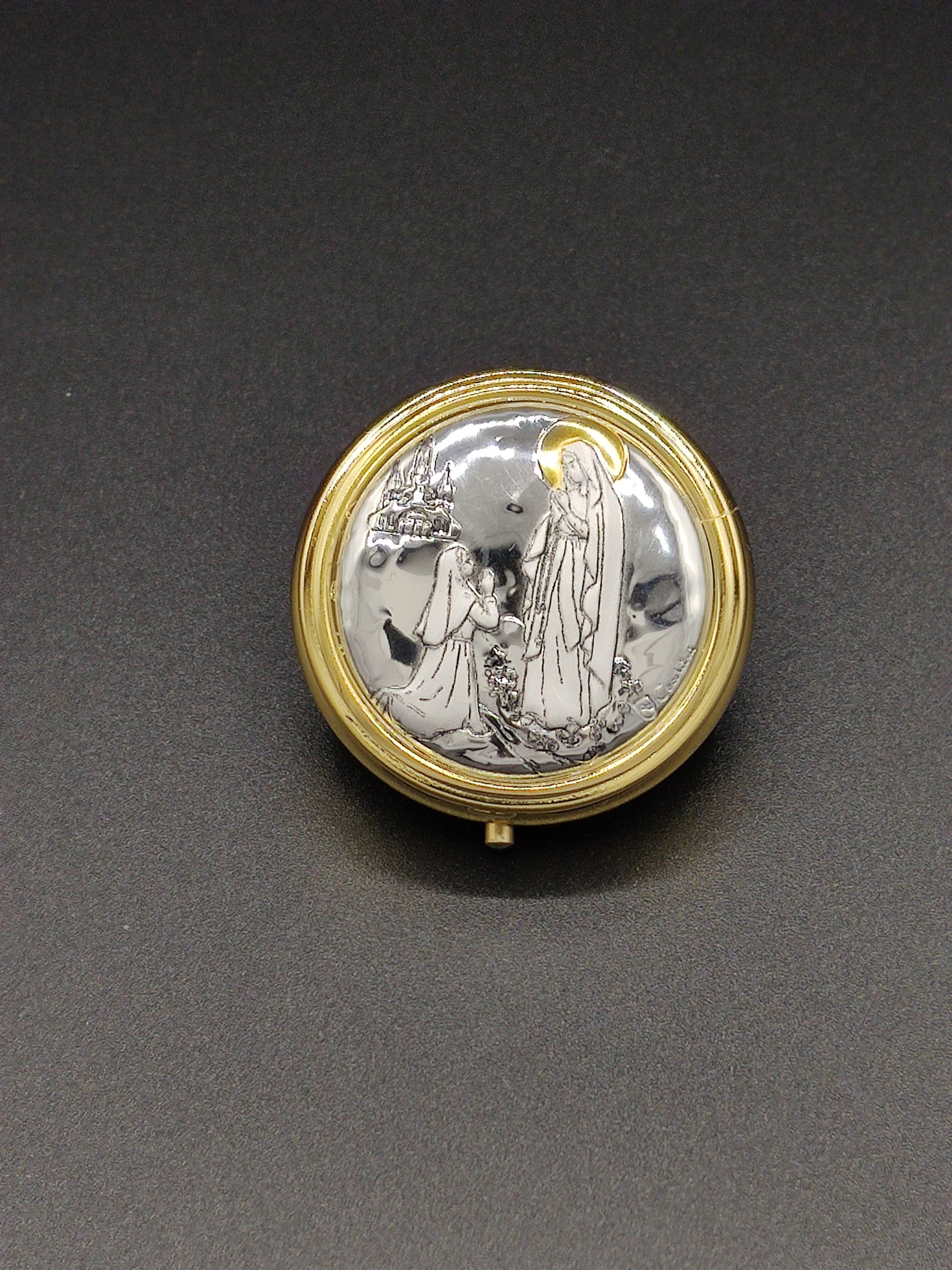 Caja de metal dorado o «viatico» en forma redonda que se utiliza para llevar formas sin gluten para tomar la sagrada comunión.