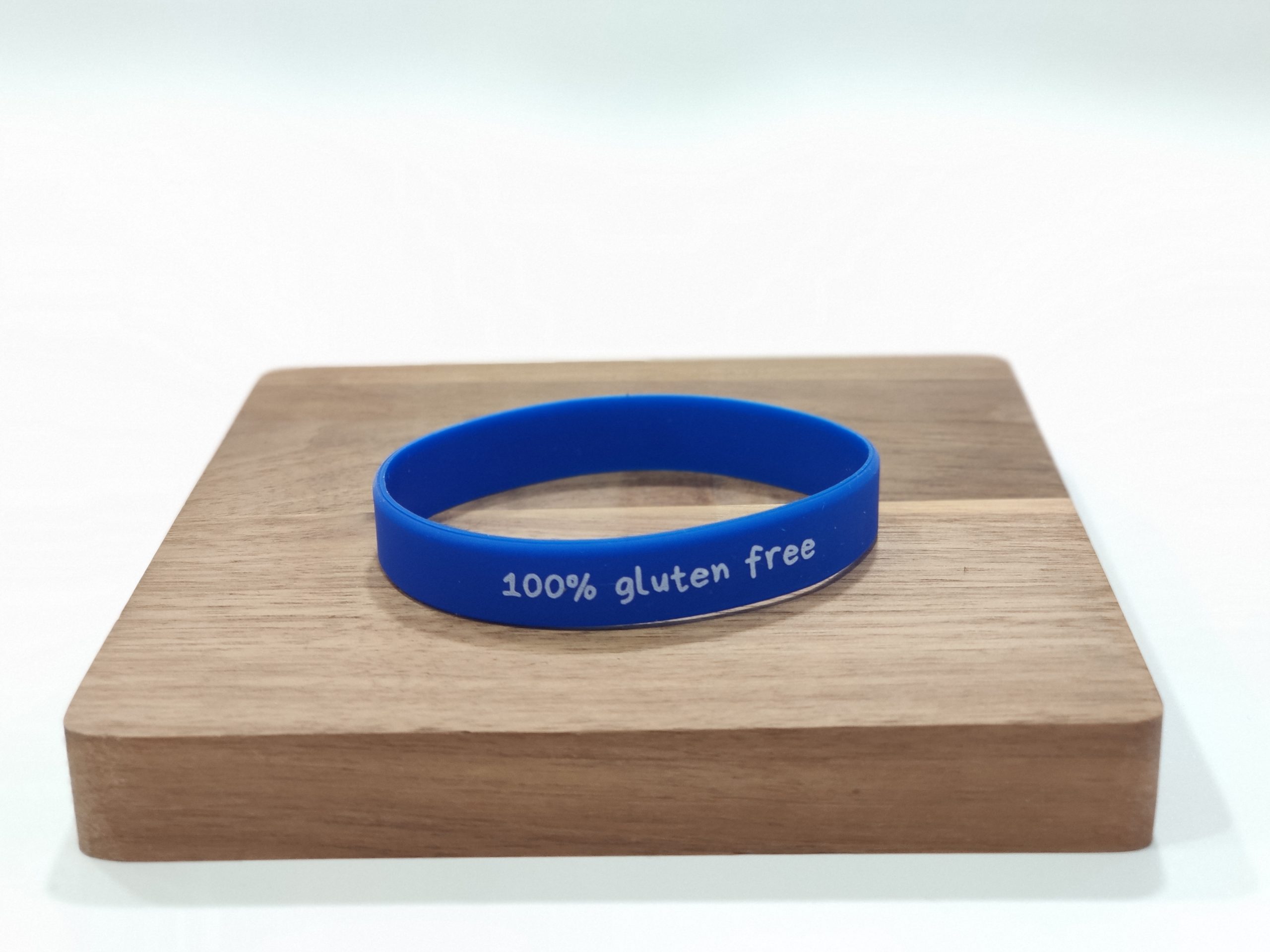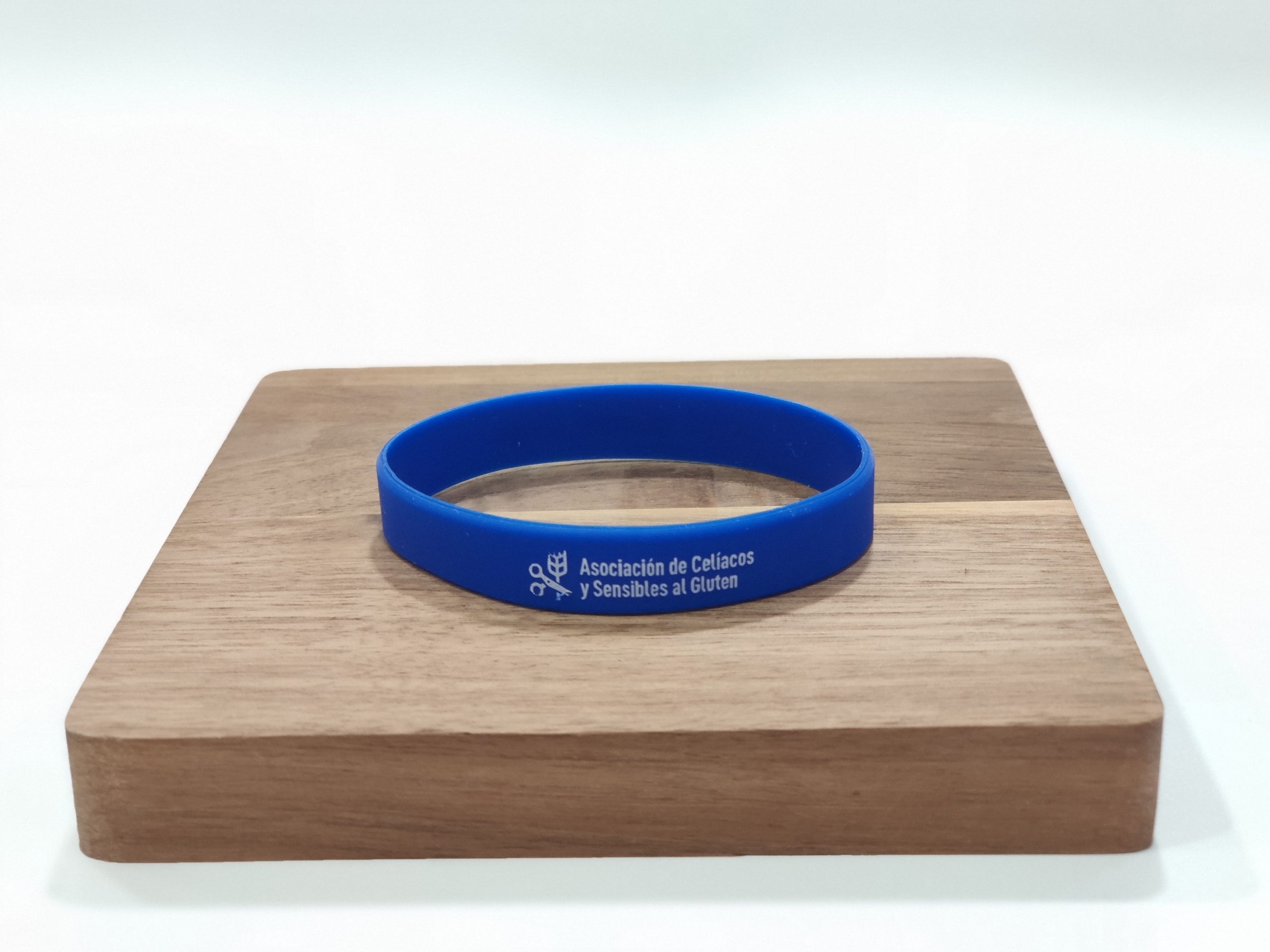 Pulsera de silicona con el logo de la Asociación y también la leyenda «100% gluten free»
