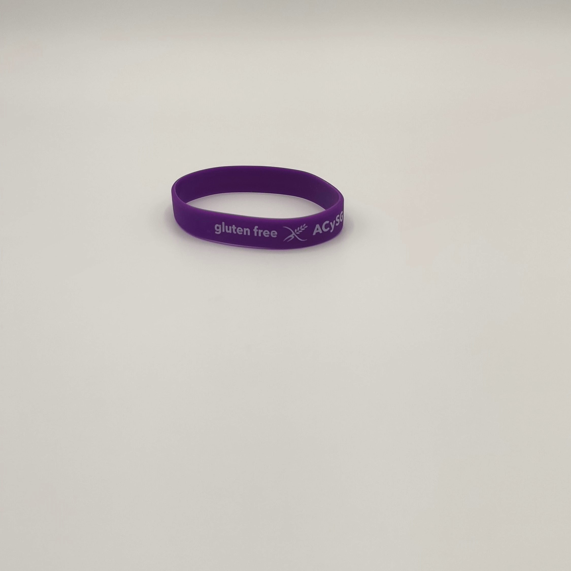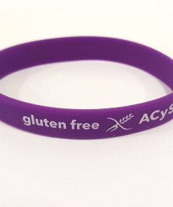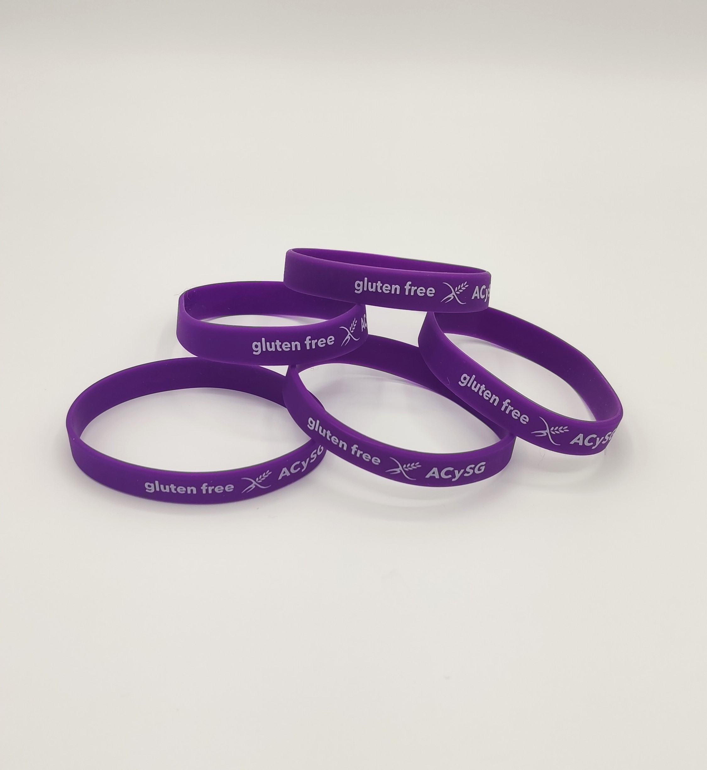 Pulsera de silicona con nuestro logo y ACySG y también nuestra leyenda «sin gluten» «gluten free»