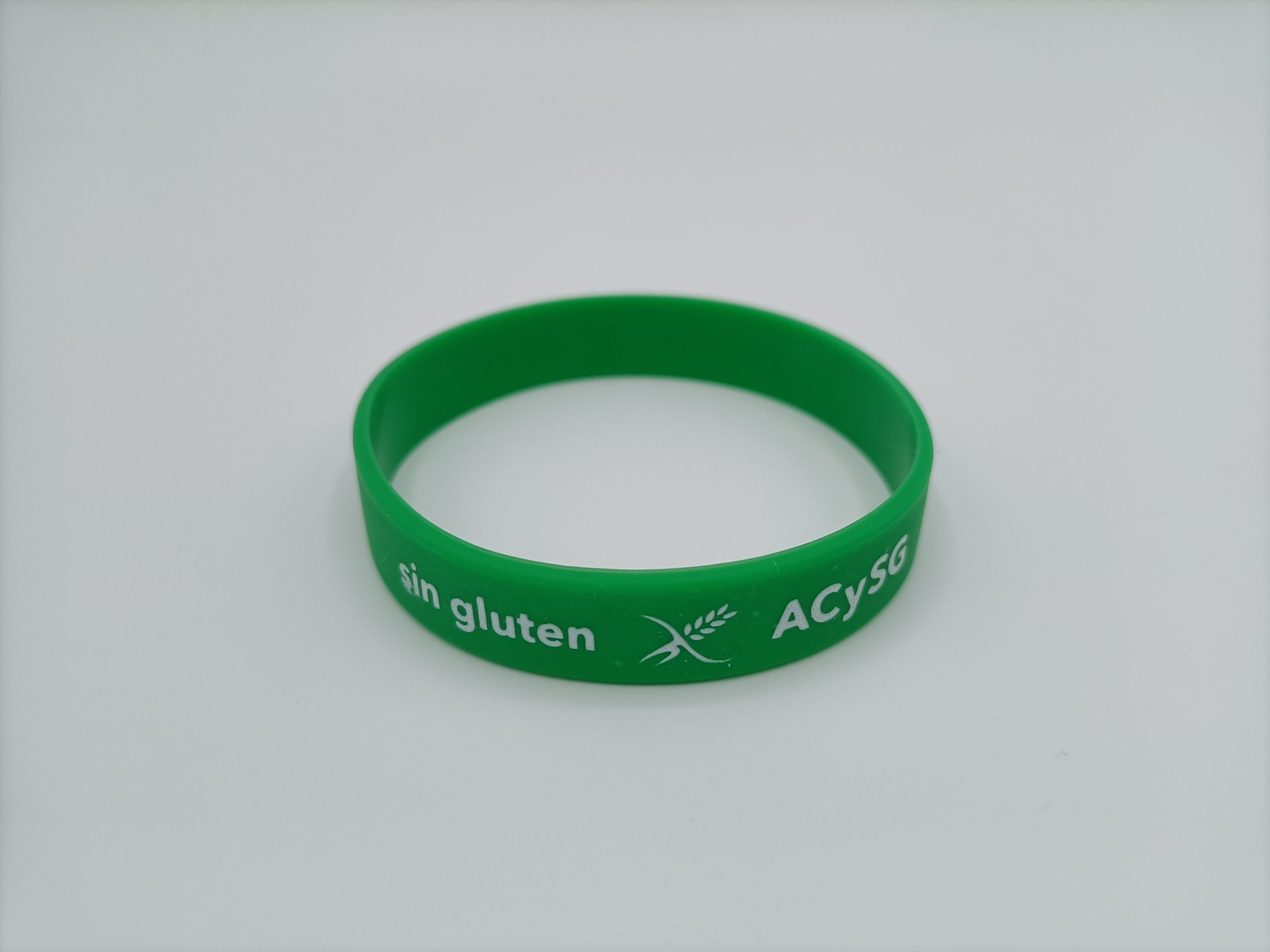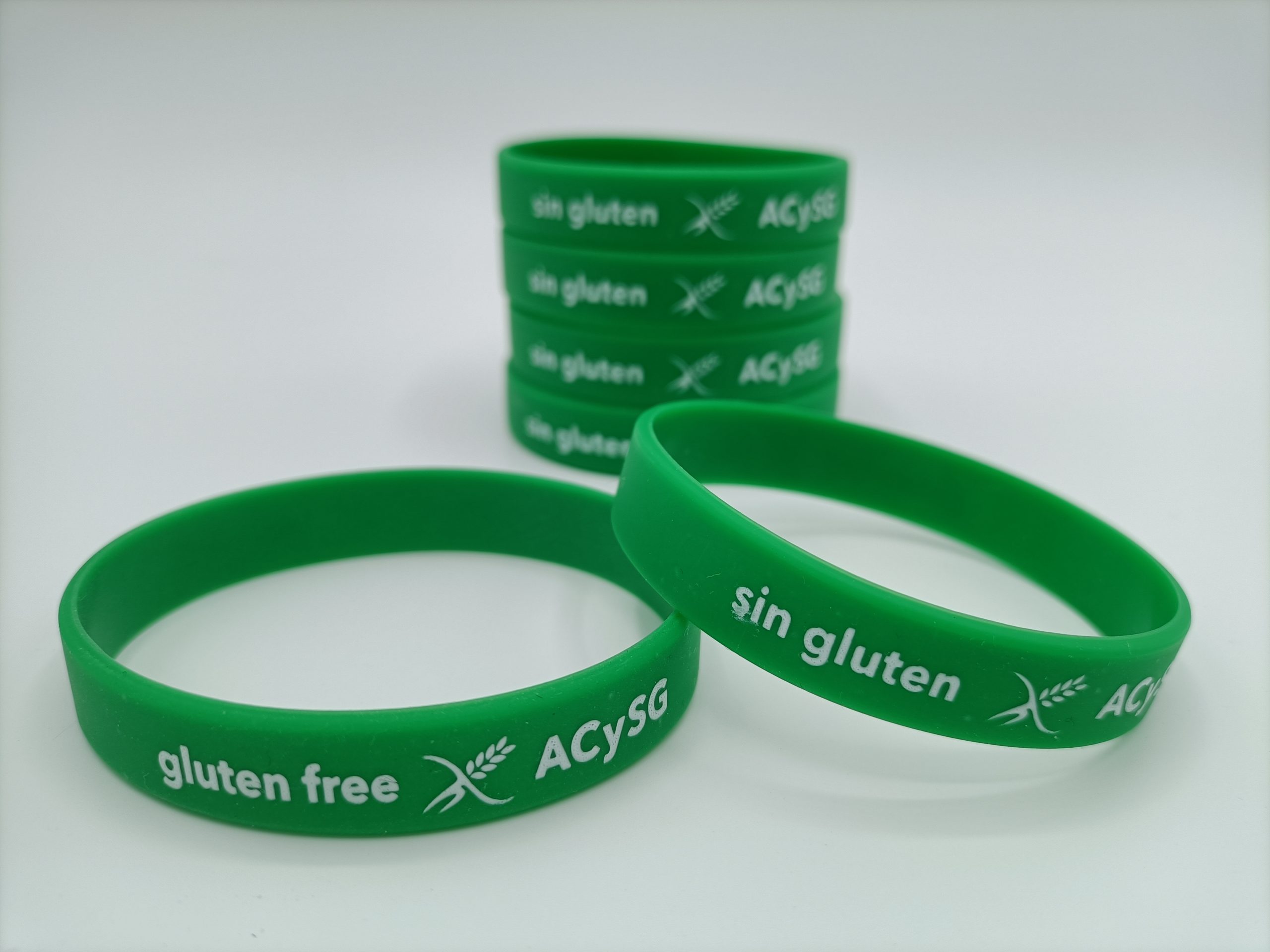 Pulsera de silicona con nuestro logo y ACySG y también nuestra leyenda «sin gluten» «gluten free»