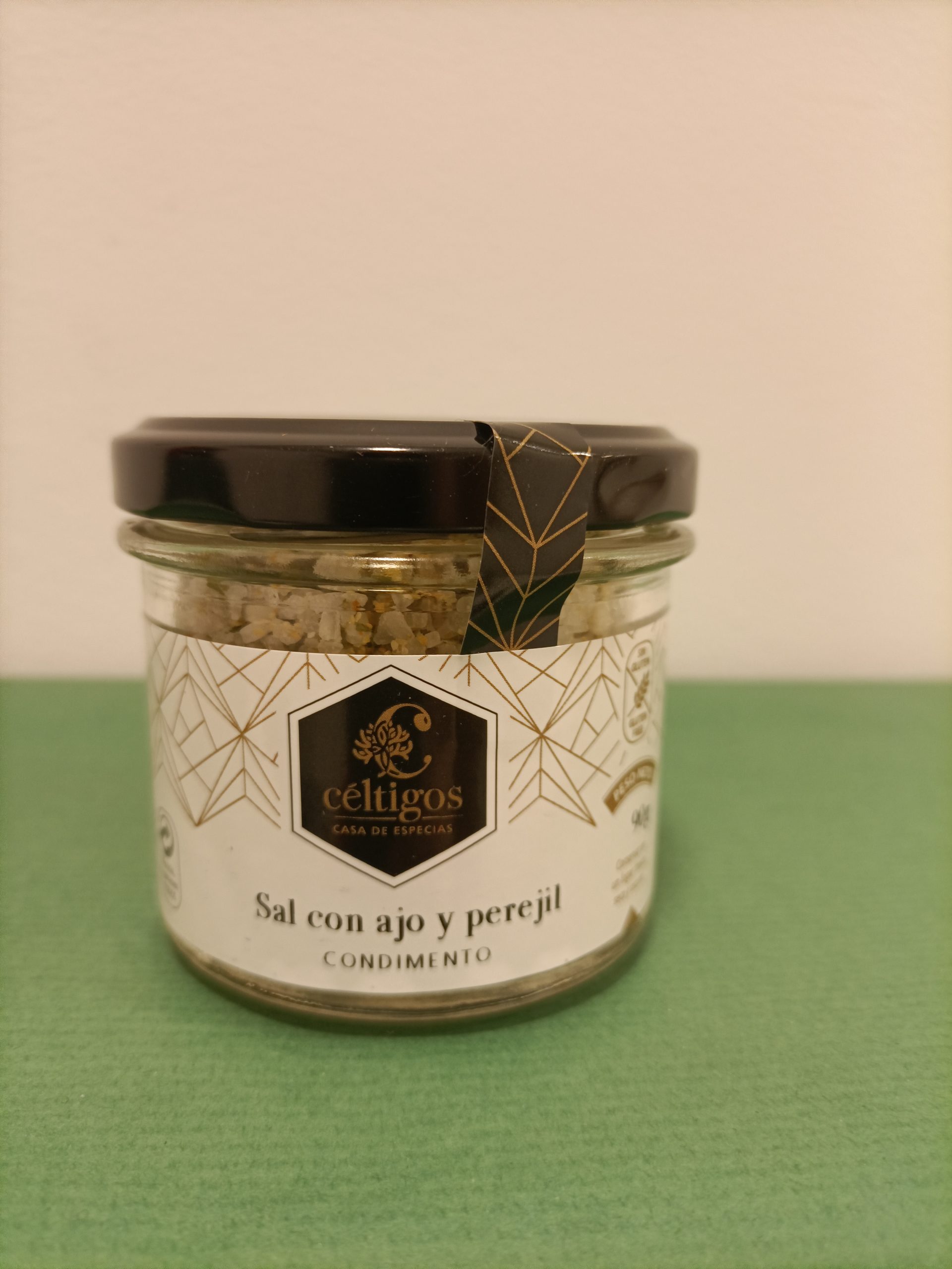 Sal marina, ajo y perejil, de la marca CÉLTIGOS, sin gluten, frasco de cristal de 90 g.