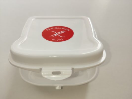 Fiambrera de 450ml de capacidad, con cierre de seguridad y logo «Sin Gluten».Ideal para llevar el desayuno o la merienda al cole. Medidas: L.14cm An.14cm Al. 5cm
