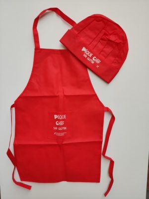 Delantal fabricado en tejido non-woven, de talla única, para niños. Disponen de bolsillo central y su gorro de cocina, para el chef de la casa.